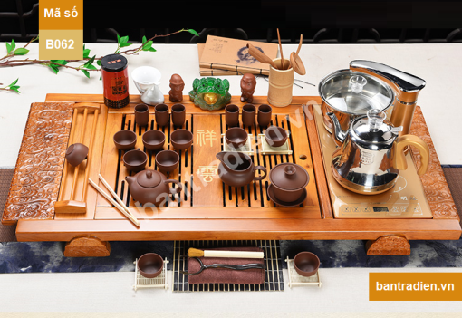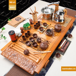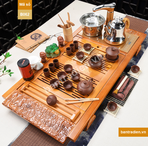 Bộ bàn trà điện thông minh B062 mang phong cách thiết kế và nhiều họa tiết truyền thống. B062 được làm hoàn toàn bằng gỗ tự nhiên 100% kèm nhiều tiện ích: