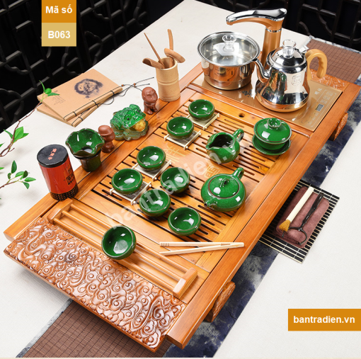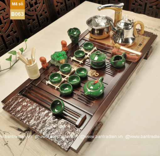 Bộ bàn trà điện thông minh khay rời B063 được làm 100% từ gỗ tự nhiên cao cấp đã qua xử lý, chịu được nhiệt độ cao và nước, mặt bàn được thiết kế nhiều đường xọc để đổ thẳng nước thải xuống và ko bị bám cặn bên trên mặt – kèm theo bộ bàn là bộ ấm chén và bộ phụ kiện trà đạo và sẽ là sản phẩm tuyệt vời mà bạn không nên bỏ qua..