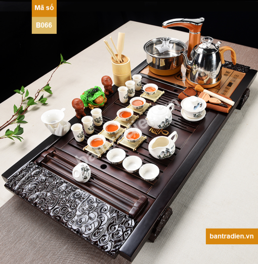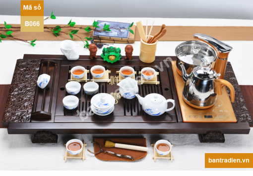 Bộ bàn trà điện thông minh khay rời B066 được làm 100% từ gỗ tự nhiên cao cấp đã qua xử lý, chịu được nhiệt độ cao và nước, mặt bàn được thiết kế nhiều đường xọc để đổ thẳng nước thải xuống và ko bị bám cặn bên trên mặt – kèm theo bộ bàn là bộ ấm chén và bộ phụ kiện trà đạo và sẽ là sản phẩm tuyệt vời mà bạn không nên bỏ qua..