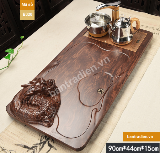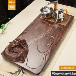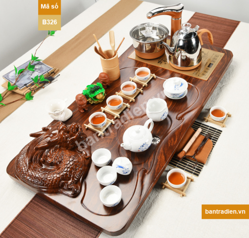 Bộ bàn trà điện thông minh B326 mang phong cách thiết kế đơn giản, hiện đại với họa tiết Thần Long trạm nổi. Được làm bằng gỗ tự nhiên, đi kèm có nhiều tiện ích: