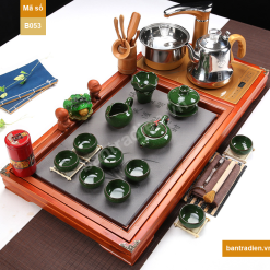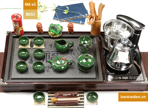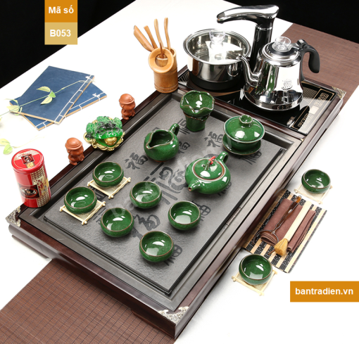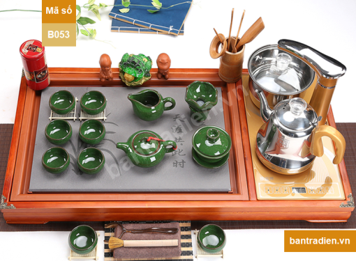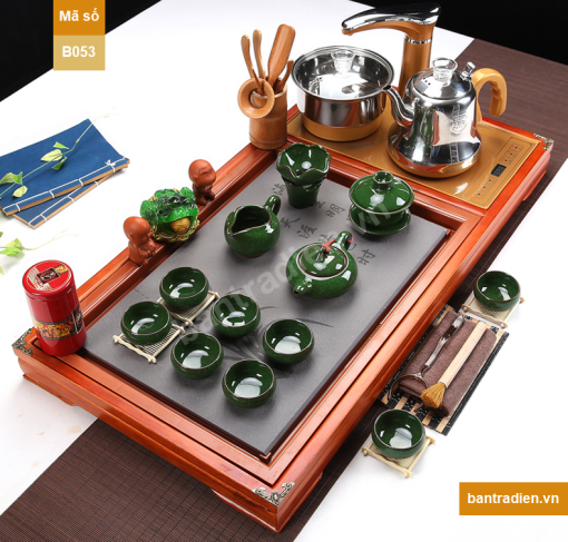 Bộ bàn trà điện thông minh khay rời B053 được làm 100% từ gỗ tự nhiên cao cấp đã qua xử lý, chịu được nhiệt độ cao và nước, mặt bàn ốp đá để đổ thẳng nước thải xuống mà ko bị bám cặn bên trên mặt – kèm theo bộ bàn là bộ ấm chén và bộ phụ kiện trà đạo và sẽ là sản phẩm tuyệt vời mà bạn không nên bỏ qua.