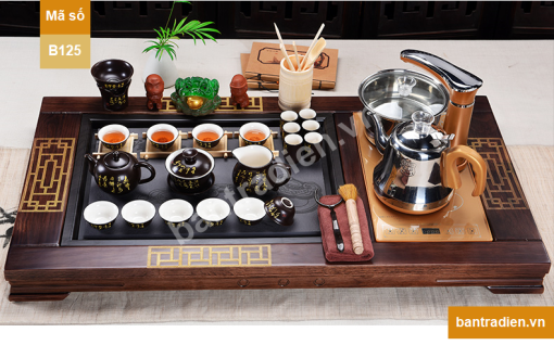 Bộ bàn trà điện thông minh B125 mang phong cách thiết kế Cung Đình truyền thống xen lẫn các đường nét trang trí họa tiết sang trọng. Làm nên bộ sản phẩm thực sự sang trọng đẳng cấp. B125 được làm bằng gỗ tự nhiên và mặt bàn làm bằng đá, đi kèm có nhiều tiện ích: