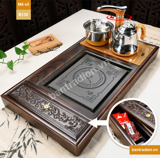 Bộ bàn trà điện thông minh B131 mang phong cách thiết kế truyền thống xen lẫn các đường nét trang trí họa tiết sang trọng. Làm nên bộ sản phẩm thực sự sang trọng đẳng cấp. B131 được làm bằng gỗ tự nhiên và mặt bàn làm bằng đá, đi kèm có nhiều tiện ích: