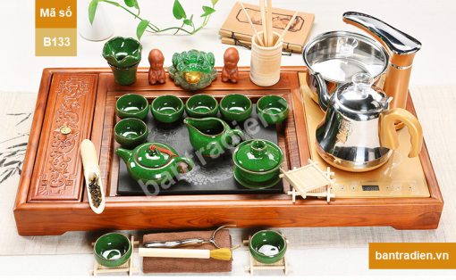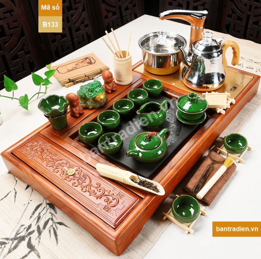 Bộ bàn trà điện thông minh B133 mang phong cách thiết kế truyền thống xen lẫn các đường nét trang trí họa tiết sang trọng. Làm nên bộ sản phẩm thực sự sang trọng đẳng cấp. B133 được làm bằng gỗ tự nhiên và mặt bàn làm bằng đá, đi kèm có nhiều tiện ích: