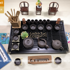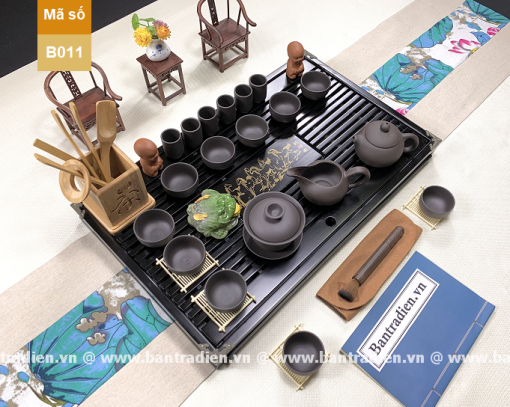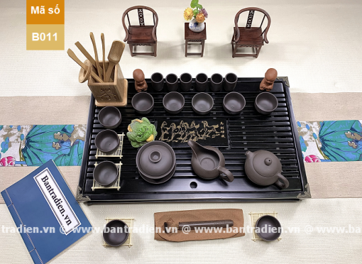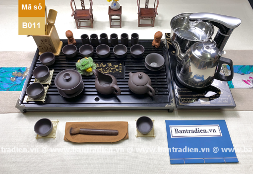 Bộ bàn trà điện thông minh khay rời B011 được làm 100% từ gỗ tự nhiên cao cấp đã qua xử lý, chịu được nhiệt độ cao và nước, mặt bàn được thiết kế nhiều khe hở để đổ thẳng nước thải xuống mà ko bị bám cặn bên trên mặt – kèm theo bộ bàn là bộ ấm chén và bộ phụ kiện trà đạo và sẽ là sản phẩm tuyệt vời mà bạn không nên bỏ qua.