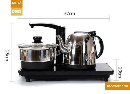 Bộ bếp đun trà đạo điện tử D003 là bộ sản phẩm thiết thực phục vụ và đáp ứng sở thích uống trà. Cấu tạo bộ bếp gồm 2 phần chính là vòi cấp nước gắn cùng bếp đun và bộ ấm đun, nồi chần. Mọi thao tác từ bơm nước, tráng rửa ấm chén, cho đến đun sôi nước đều thao tác ngay tại chỗ.